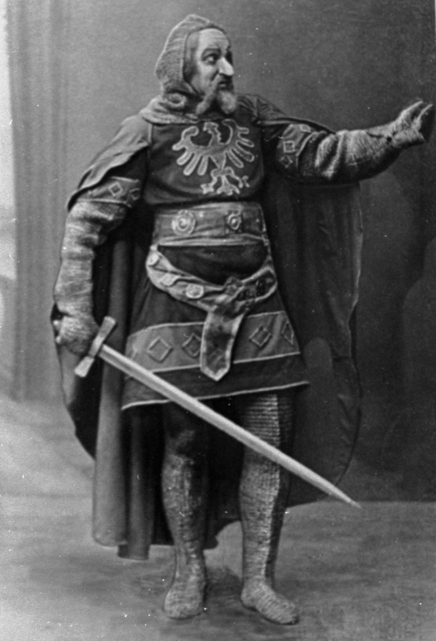 Aktieris Aleksis Mierlauks Berneka lomā Raiņa traģēdijas "Indulis un Ārija" pirmiestudējumā Jaunajā Rīgas teātrī. Režisors Alfrēds Amtmanis-Briedītis, scenogrāfs Jānis Kuga.