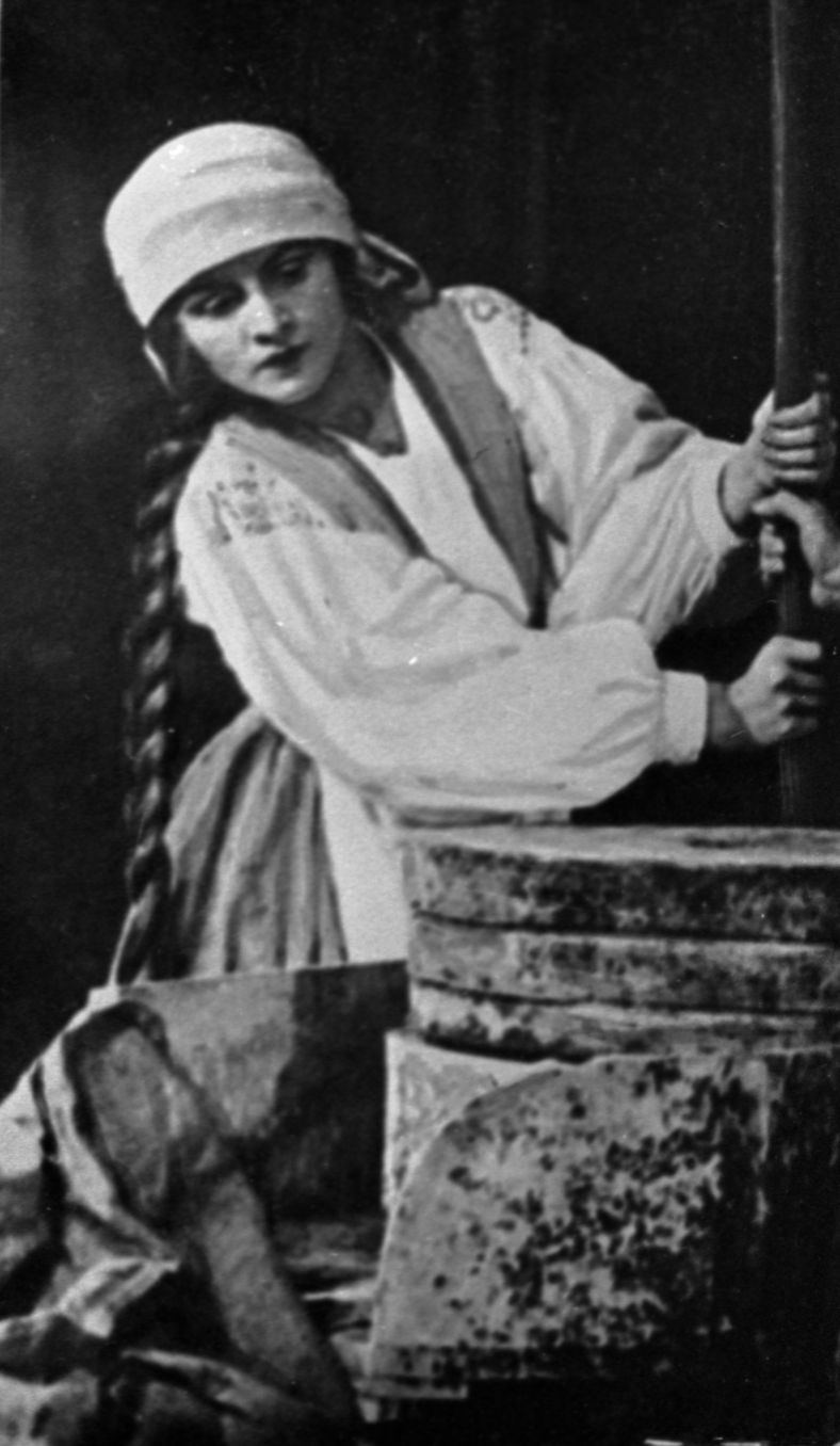 Aktrise Elvīra Bramberga Baibas lomā Raiņa lugas "Pūt, vējiņi!" iestudējumā Dailes teātrī. Izrāde veltīta Raiņa piemiņai, inscenētājs Eduards Smiļģis, scenogrāfs Oto Skulme.