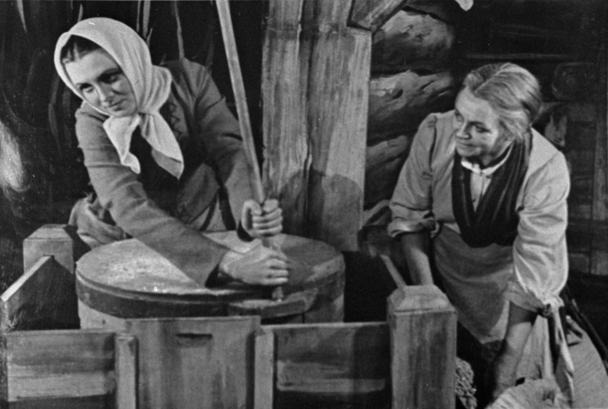 Skats no Raiņa lugas "Pūt, vējiņi!" iestudējuma Latvijas PSR Valsts Dailes teātrī. Aktrise Vija Artmane Baibas lomā, aktrise Austra Baldone Ortas lomā. Iestudējuma inscenētājs Eduards Smiļģis, režisore Felicita Ertnere.