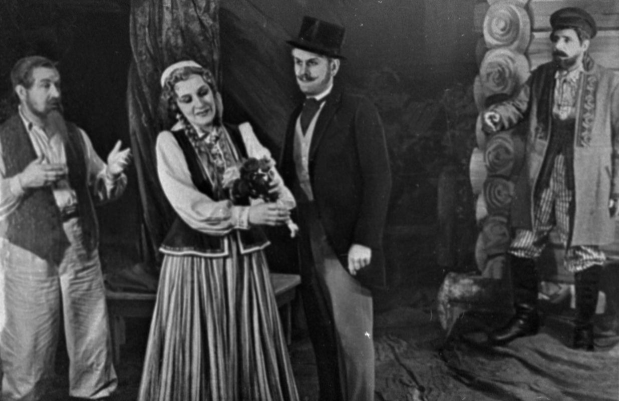 Skats no Raiņa lugas "Pusideālists" iestudējuma Latvijas PSR Drāmas teātrī. Lomās: Jānis Osis - Andēls, Olga Krūmiņa - Mariņa, Viktors Gruziņš - Jānis, Artūrs Petrovskis - Brunovics. Uzveduma inscenētājs Alfrēds Austriņš, režisors Herberts Zommers.
