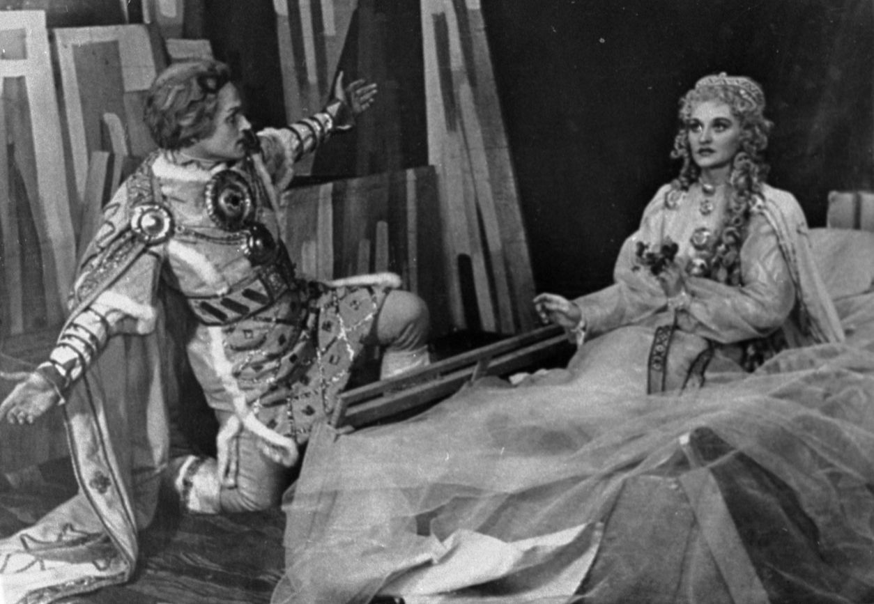 Skats no Raiņa lugas "Zelta zirgs" iestudējuma Latvijas PSR Drāmas teātrī. Rihards Zandersons Antiņa lomā un Vilma Vārna Princeses lomā. Uzveduma inscenētāja Vera Baļuna, režisors Žanis Katlaps, scenogrāfs Laimdonis Grasmanis.