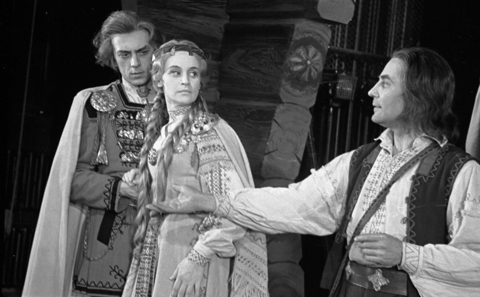 Skats no Raiņa lugas "Spēlēju, dancoju" iestudējuma Latvijas PSR Valsts Dailes teātrī. Harijs Liepiņš Tota lomā, Mudīte Šneidere Leldes lomā, Uldis Lieldidžs Zemgus lomā. Uzveduma inscenētājs Eduards Smiļģis, režisore Felicita Ertnere, mākslinieks Ģirts Vilks.