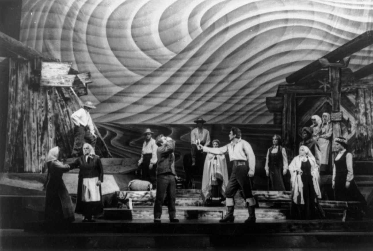 Kopskats no Raiņa lugas "Pūt, vējiņi!" iestudējuma Latvijas PSR Akadēmiskajā drāmas teātrī. Uzveduma režisors Alfrēds Janušans, scenogrāfs Gunārs Zemgals.