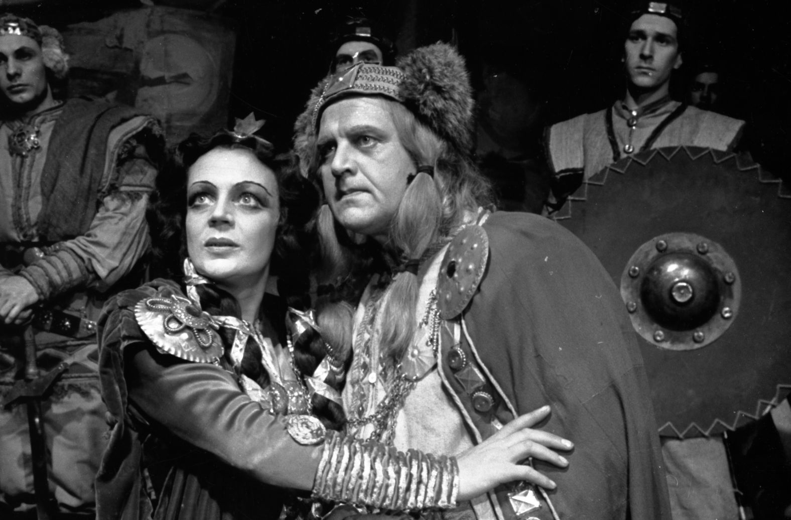 Skats no Raiņa lugas "Uguns un nakts" iestudējuma Latvijas PSR Valsts Dailes teātrī. Aktieris Artūrs Filipsons Lāčplēša lomā, aktrise Lilita Bērziņa Spīdolas lomā. Uzveduma inscenētājs Eduards Smiļģis, režisore Felicita Ertnere, scenogrāfs Oto Skulme.