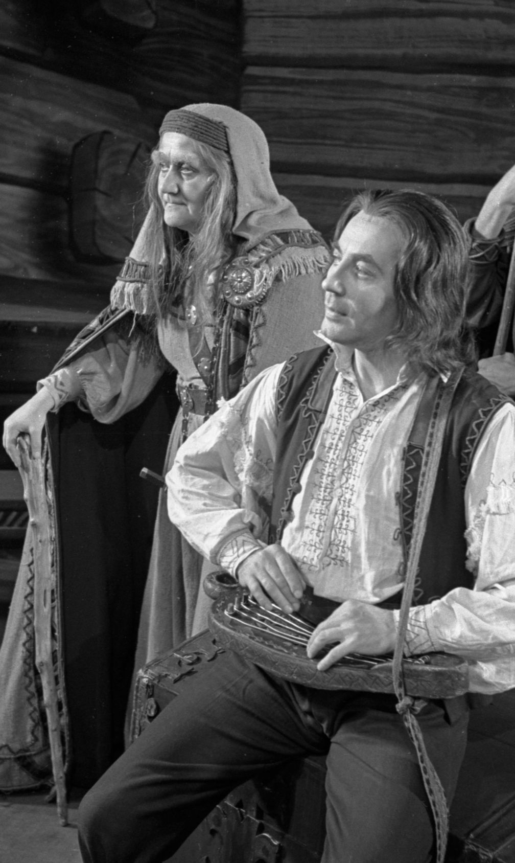 Skats no Raiņa lugas "Spēlēju, dancoju" iestudējuma Latvijas PSR Valsts Dailes teātrī. Lomās: Harijs Liepiņš - Tots, Alma Ābele - Ragana. Uzveduma inscenētājs Eduards Smiļģis, režisore Felicita Ertnere, mākslinieks Ģirts Vilks.
