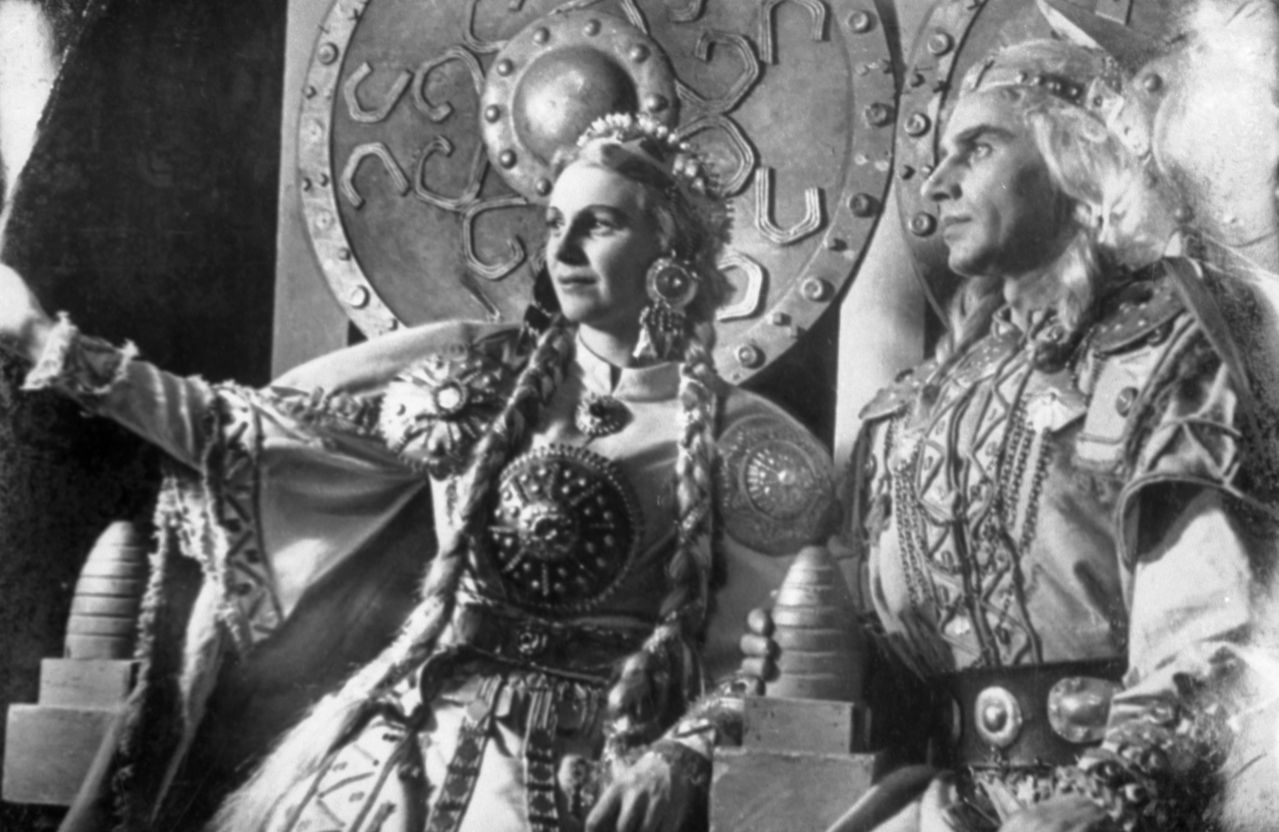 Skats no Raiņa lugas "Uguns un nakts" iestudējuma Latvijas PSR Valsts Dailes teātrī. Aktieris Edgars Zīle Lāčplēša lomā, aktrise Vilma Lasmane Laimdotas lomā. Uzveduma inscenētājs Eduards Smiļģis, režisore Felicita Ertnere, scenogrāfs Oto Skulme.
