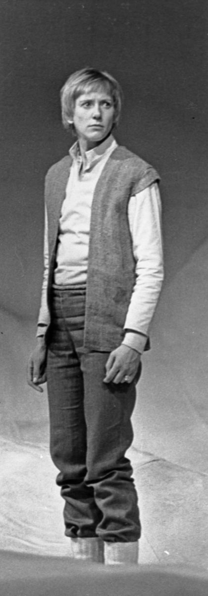 Aktrise Anda Zaice Antiņa lomā Raiņa lugas "Zelta zirgs" iestudējumā Latvijas PSR Valsts Jaunatnes teātrī. Izrādes režisors Ādolfs Šapiro, scenogrāfs Andris Freibergs.