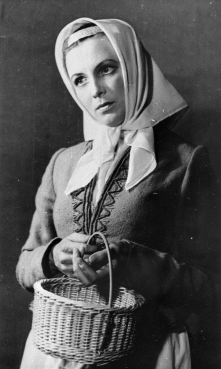 Aktrise Vija Artmane Baibas lomā Raiņa lugas "Pūt, vējiņi!" 1955. gada iestudējumā Latvijas PSR Valsts Dailes teātrī. Uzveduma inscenētājs Eduards Smiļģis, režisore Felicita Ertnere.