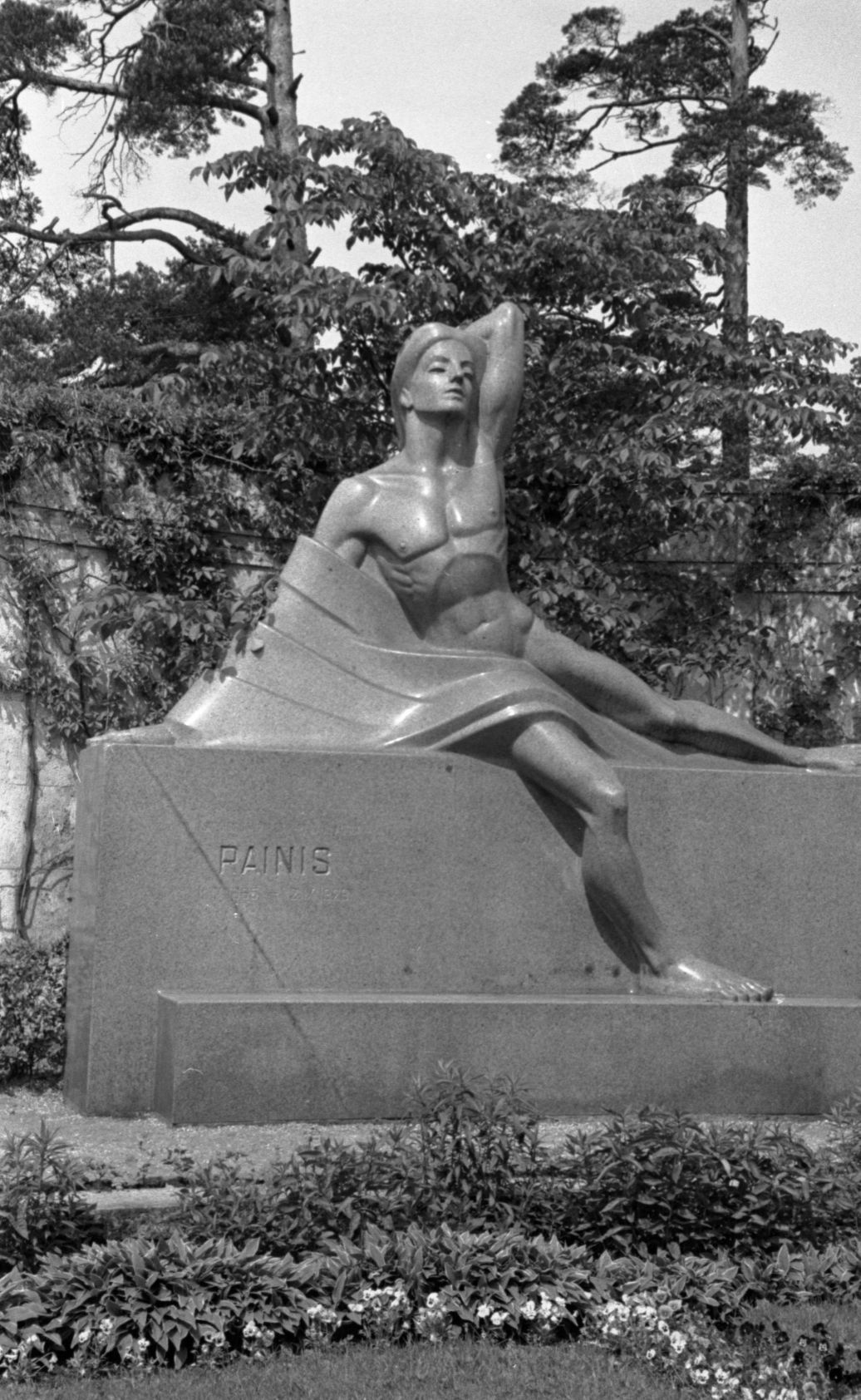 Raiņa kapa piemineklis "Ģēnija pamošanās" Raiņa kapos, pieminekļa tēlnieks Kārlis Zemdega, kolonādes arhitekts Pēteris Ārends.