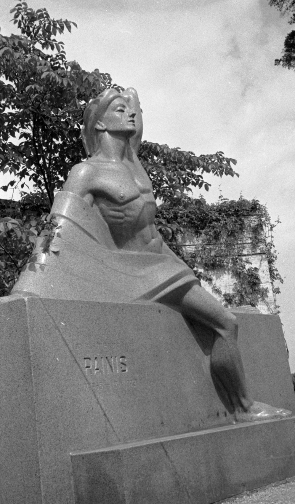 Raiņa kapa piemineklis "Ģēnija pamošanās" Raiņa kapos, pieminekļa tēlnieks Kārlis Zemdega, kolonādes arhitekts Pēteris Ārends.