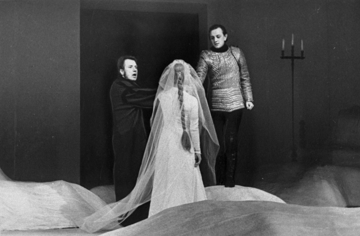 Skats no Raiņa lugas "Zelta zirgs" iestudējuma Latvijas PSR Valsts Jaunatnes teātrī. Aktieris Aleksandrs Maizuks Karaļa lomā, aktieris Andris Mekšs Melnā prinča lomā, aktrise Tamāra Soboļeva Saulcerītes lomā. Iestudējuma režisors Ādolfs Šapiro, scenogrāfs Andris Freibergs.