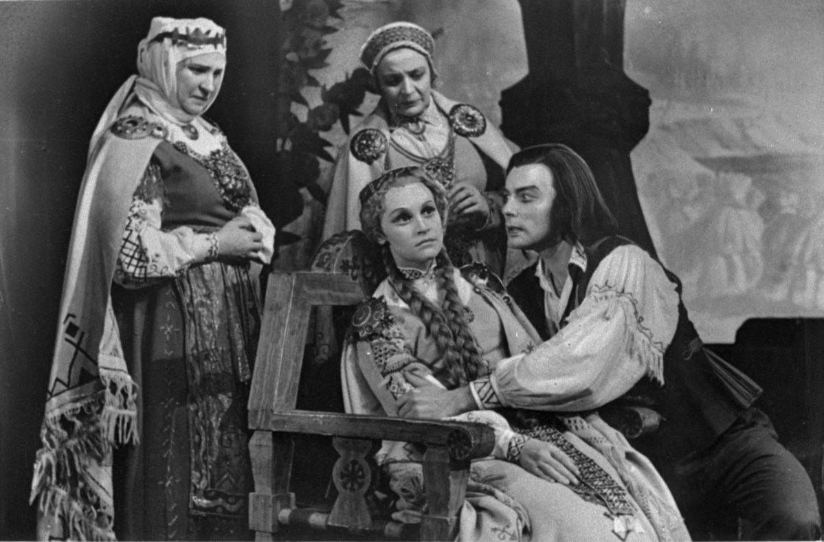 Skats no Raiņa lugas "Spēlēju, dancoju" iestudējuma Latvijas PSR Valsts Dailes teātrī. Lomās: Harijs Liepiņš - Tots, Mudīte Šneidere - Lelde, Lilita Bērziņa - Meitas māte, Lilija Žvīgule - Dēla māte. Uzveduma inscenētājs Eduards Smiļģis, režisore Felicita Ertnere, mākslinieks Ģirts Vilks.