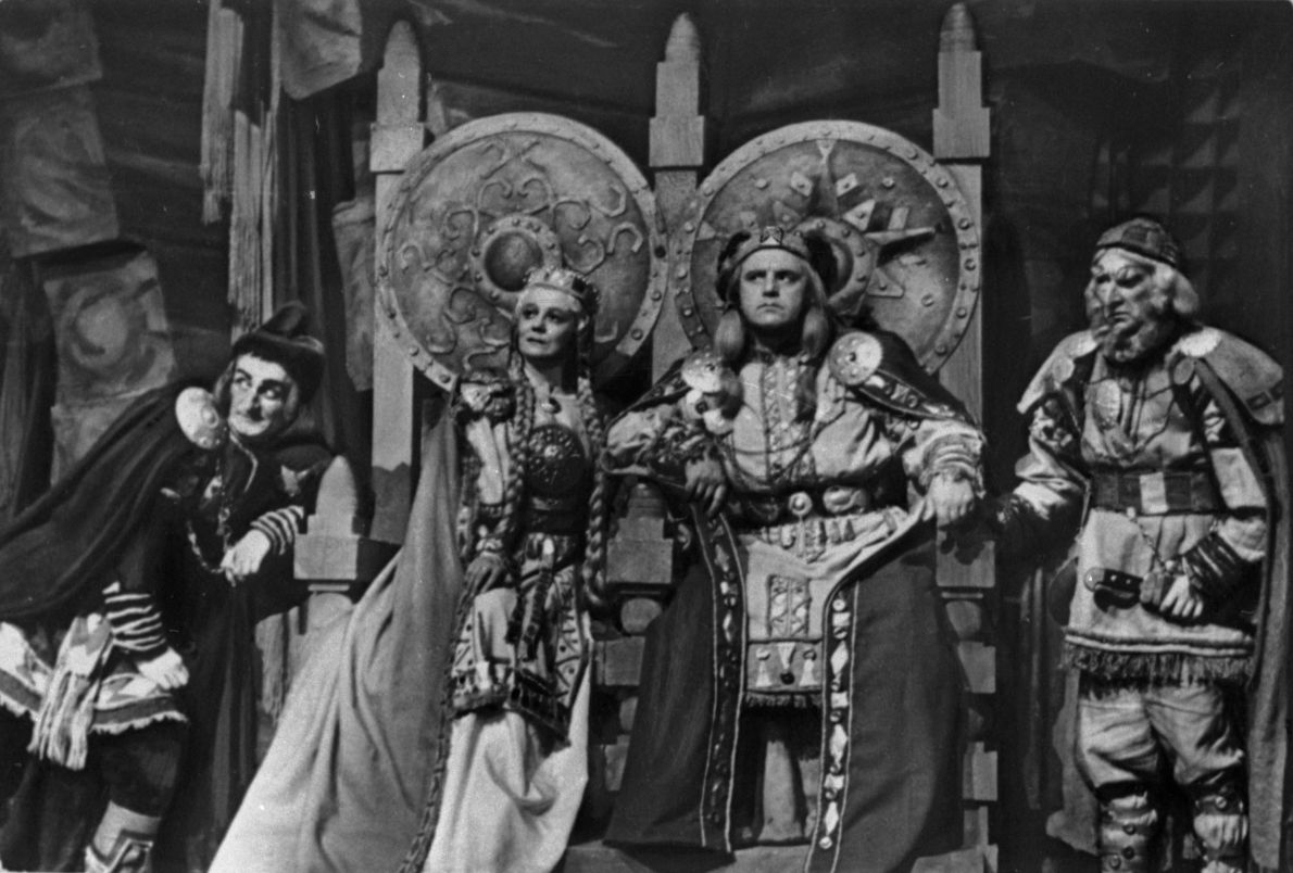 Skats no Raiņa lugas "Uguns un nakts" iestudējuma Latvijas PSR Valsts Dailes teātrī. Lomās: Artūrs Filipsons - Lāčplēsis, Irma Laiva - Laimdota, Luijs Šmits - Kangars. Uzveduma inscenētājs Eduards Smiļģis, režisore Felicita Ertnere, scenogrāfs Oto Skulme.