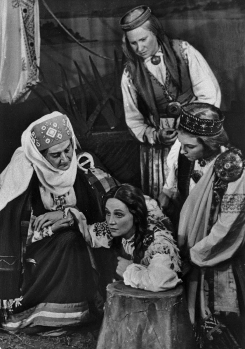 Skats no Raiņa lugas "Pūt, vējiņi!" iestudējuma Latvijas PSR Valsts Dailes teātrī. Lomās: Alma Ābele - Māte, Velta Krūze - Zane, Lilija Žvīgule - Ciepa, Vilma Lasmane - Anda. Iestudējuma režisore Felicita Ertnere.