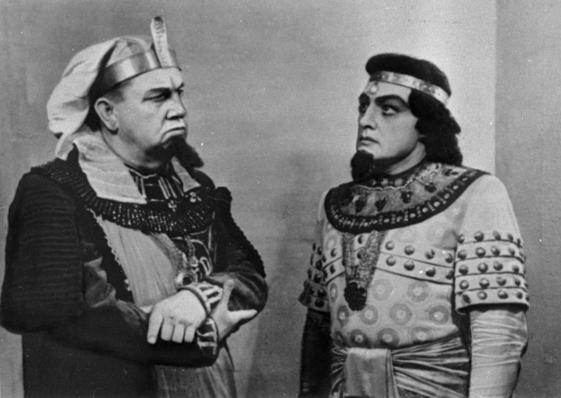 Skats no Raiņa lugas "Jāzeps un viņa brāļi" iestudējuma Latvijas PSR Akadēmiskajā drāmas teātrī. Jānis Osis Potifera lomā un Žanis Katlaps Jāzepa lomā. Uzveduma režisors Alfrēds Amtmanis-Briedītis, scenogrāfs Arvīds Spertāls.