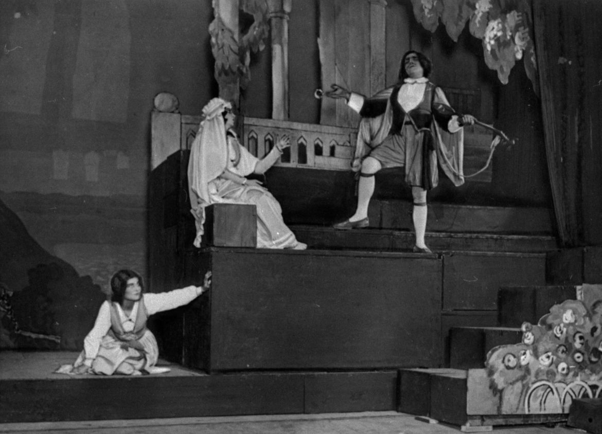 Skats no Raiņa lugas "Mīla stiprāka par nāvi" iestudējuma Dailes teātrī. Uzveduma inscenētājs Eduards Smiļģis, scenogrāfs Oto Skulme.