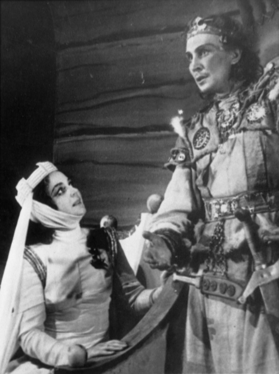Skats no Raiņa lugas "Indulis un Ārija" iestudējuma Latvijas PSR Valsts Dailes teātrī. Aktieris Artūrs Dimiters Induļa lomā, aktrise Lilita Bērziņa Ārijas lomā. Iestudējuma inscenētājs Eduards Smiļģis, režisore Felicita Ertnere.