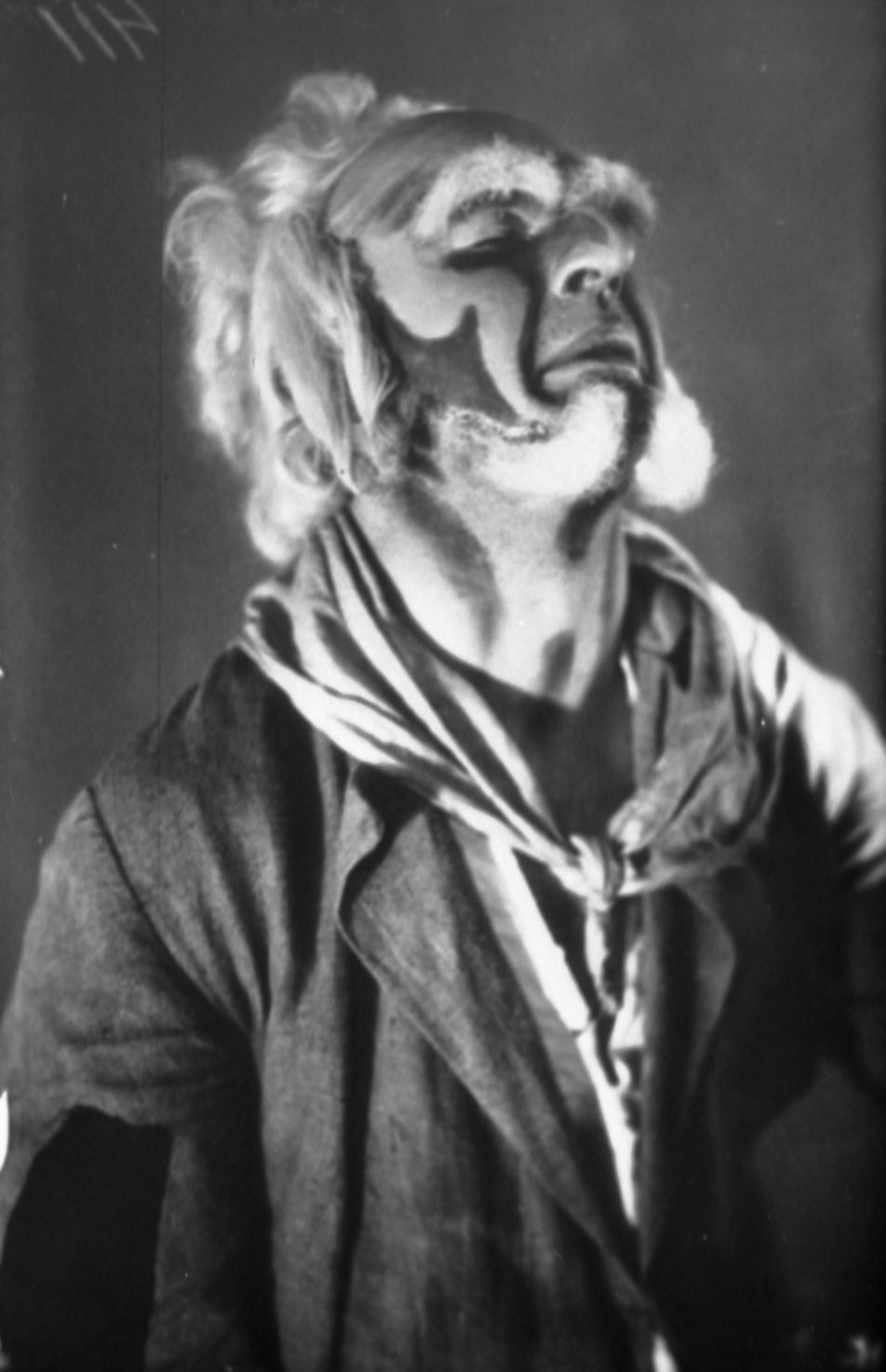 Aktieris Augusts Mitrēvics Aklā lomā Raiņa lugas "Spēlēju, dancoju" iestudējumā Dailes teātrī. Uzveduma inscenētājs Eduards Smiļģis, scenogrāfs Oto Skulme.