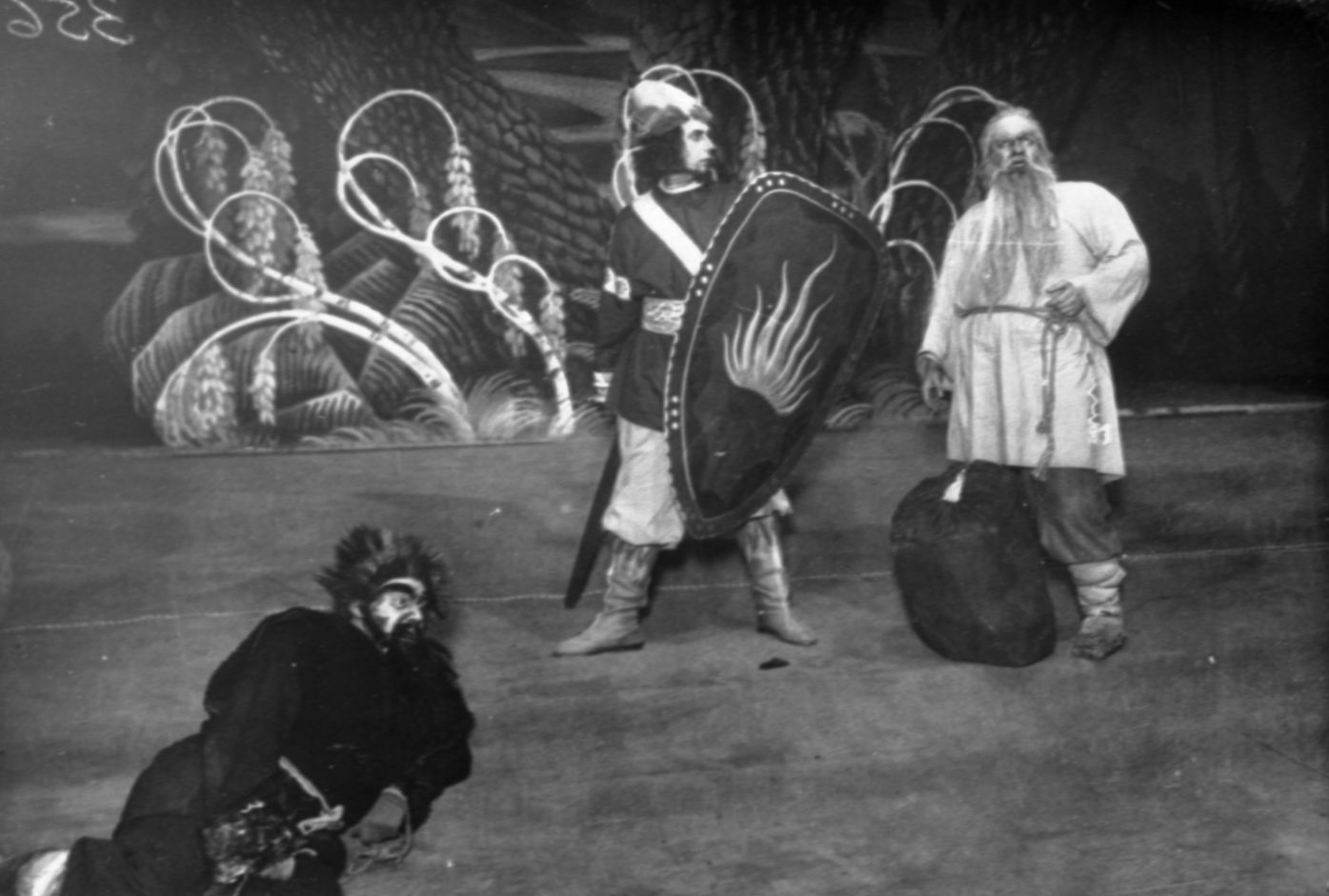 Aina no Raiņa traģēdijas "Ilja Muromietis" iestudējuma Latvijas Nacionālajā teātrī. Lomās aktieri (no kreisās): Reinis Parņickis - Svilpis-lupis, Jānis Ģērmanis - Ilja Muromietis, Jānis Osis - Mikula. Uzveduma režisors Alfrēds Amtmanis-Briedītis, scenogrāfs Ludolfs Liberts.