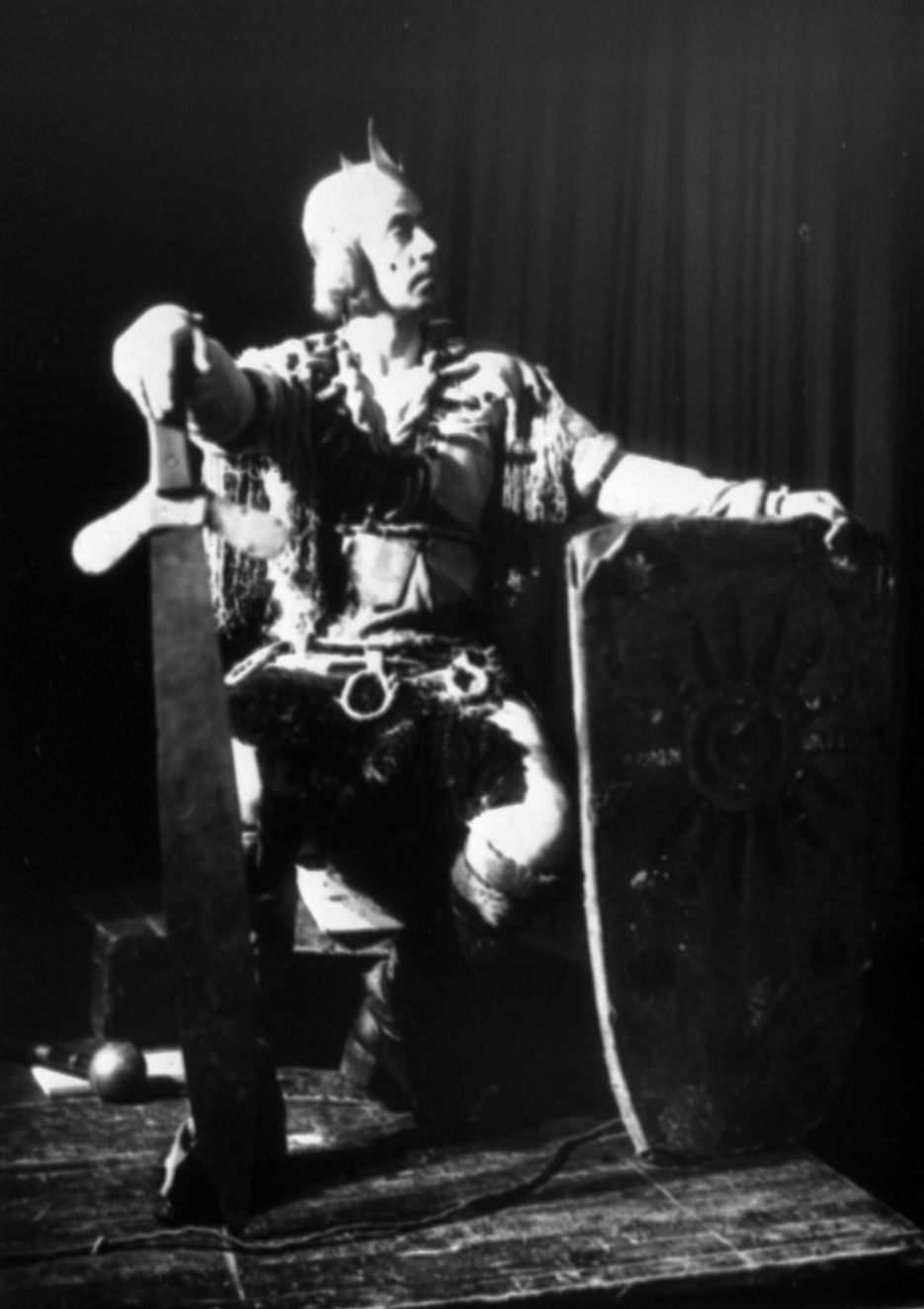 Eduards Smiļģis Induļa lomā Raiņa lugas "Indulis un Ārija" iestudējumā Dailes teātrī. Uzveduma inscenētājs Eduards Smiļģis, scenogrāfs Oto Skulme.