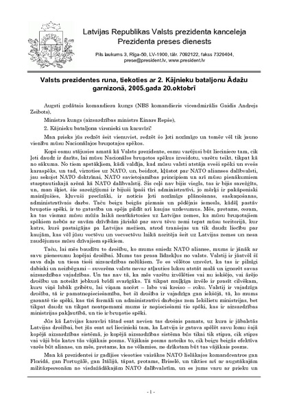 Valsts prezidentes runa, tiekoties ar 2. Kājnieku bataljonu Ādažu garnizonā, 2005.gada 20.oktobrī
