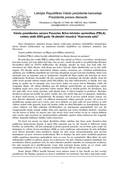 Valsts prezidentes uzruna Pasaules Brīvo latviešu apvienības (PBLA) valdes sēdē 2005.gada 19.oktobrī viesnīcā “Konventa sēta”