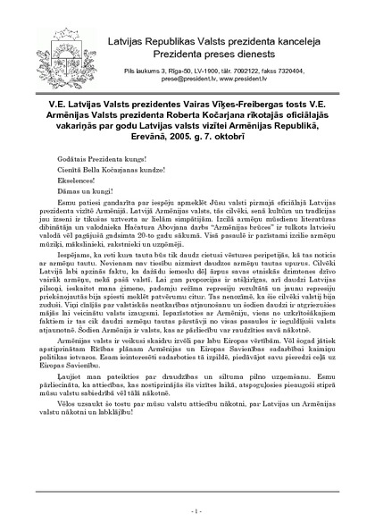 V.E. Latvijas Valsts prezidentes Vairas Vīķes-Freibergas tosts V.E. Armēnijas Valsts prezidenta Roberta Kočarjana rīkotajās oficiālajās vakariņās par godu Latvijas valsts vizītei Armēnijas Republikā, Erevānā, 2005. g. 7. oktobrī