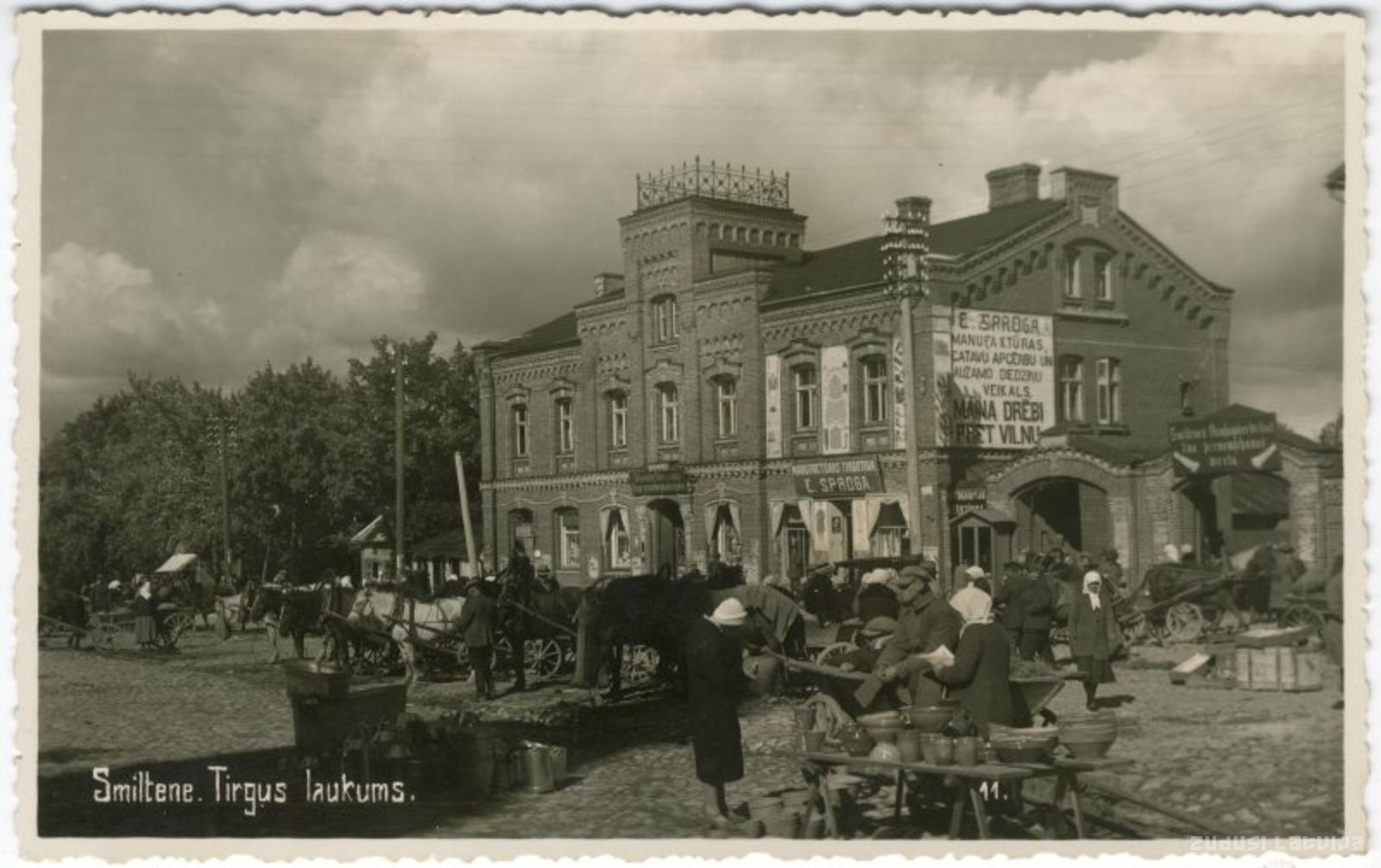 Smiltenes tirgus laukumā atrodas ēka ar uzrakstu "E.Sproģa manufaktūras gatavu apģērbu un aužamo diedziņu veikals. Maina drēbi pret vilnu"
