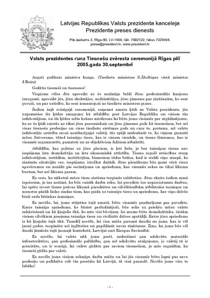 Valsts prezidentes runa Tiesnešu zvēresta ceremonijā Rīgas pilī 2005.gada 30.septembrī