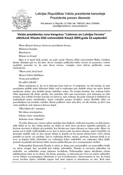 Valsts prezidentes runa kongresa “Lietuvas un Latvijas forums” atklāšanā Vitauta Dižā universitātē Kauņā 2005.gada 22.septembrī