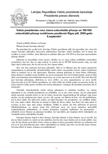 Valsts prezidentes runa Jauno naturalizēto pilsoņu un 100 000 naturalizētā pilsoņa sveikšanas pasākumā Rīgas pilī, 2005.gada 8.septembrī