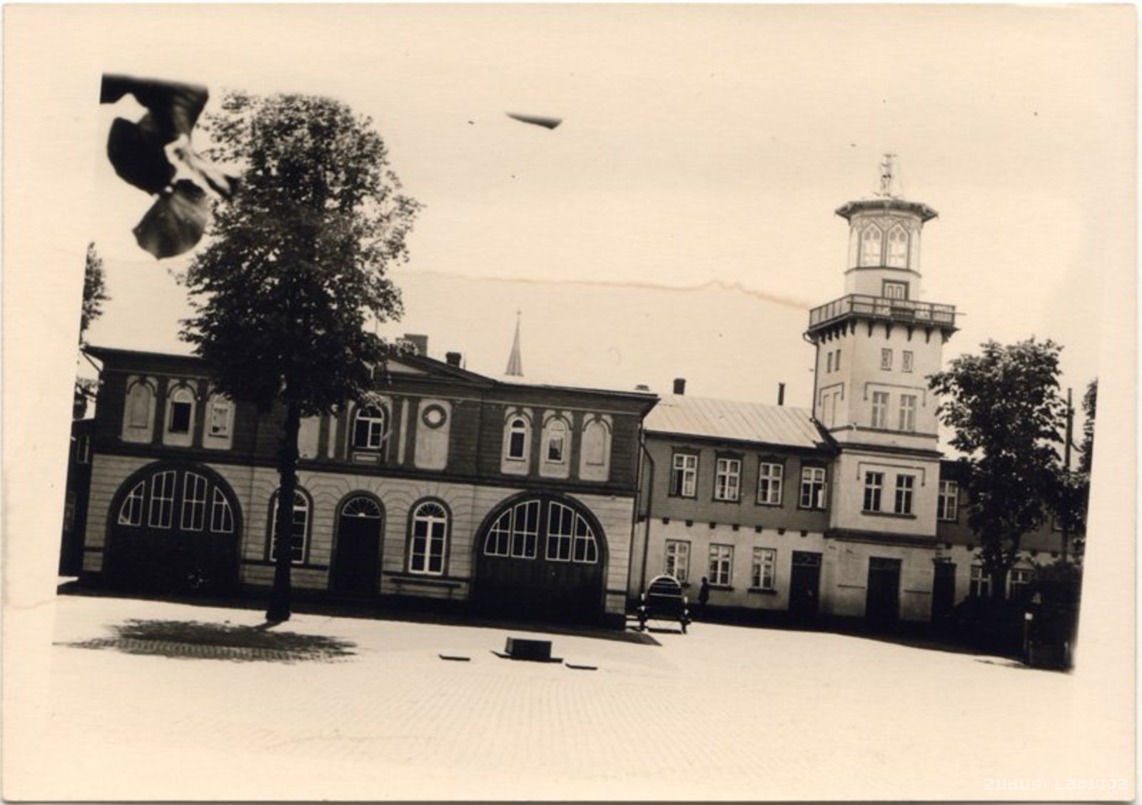 Ugunsdzēsēju depo. Namā priekšplānā pašreiz atrodas Swedbanka, savukārt attēla labajā pusē redzamais depo tornis tika nojaukts pagājušā gadsimta astoņdesmito gadu pirmajā pusē, kad tika būvēta tramvaju līnija
