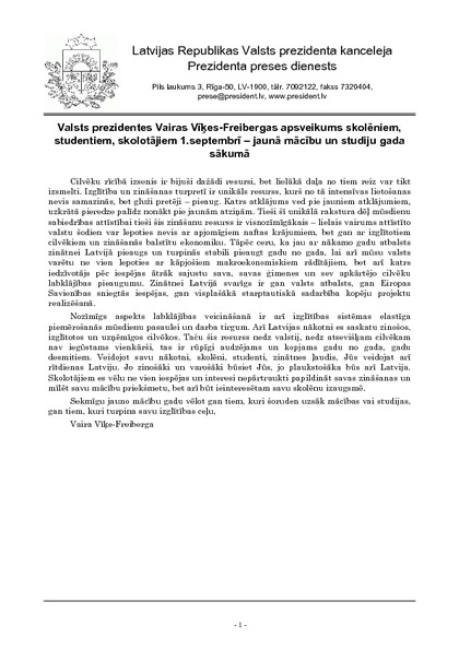 Valsts prezidentes Vairas Vīķes-Freibergas apsveikums skolēniem, studentiem, skolotājiem 1.septembrī – jaunā mācību un studiju gada sākumā