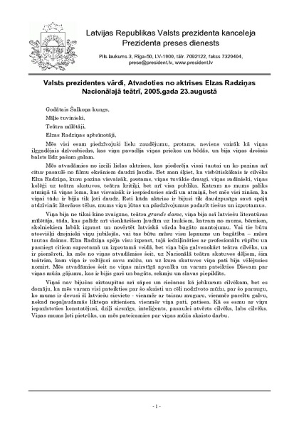 Valsts prezidentes vārdi, Atvadoties no aktrises Elzas Radziņas Nacionālajā teātrī, 2005.gada 23.augustā
