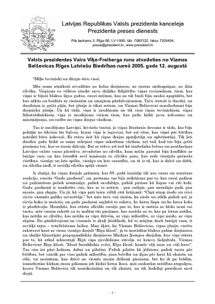 Valsts prezidentes Vaira Vīķe-Freiberga runa atvadoties no Vizmas Belševicas Rīgas Latviešu Biedrības namā 2005. gada 12. augustā