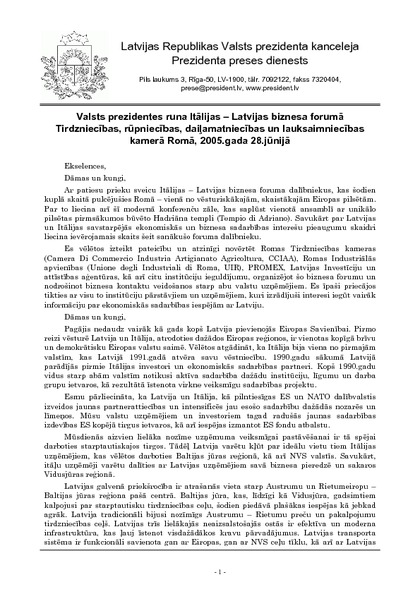Valsts prezidentes runa Itālijas – Latvijas biznesa forumā Tirdzniecības, rūpniecības, daiļamatniecības un lauksaimniecības kamerā Romā, 2005.gada 28.jūnijā