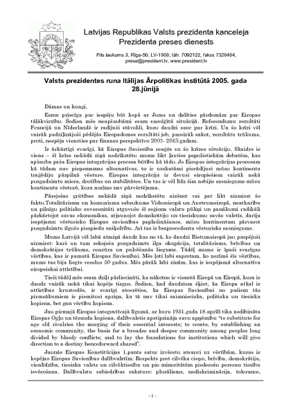 Valsts prezidentes runa Itālijas Ārpolitikas institūtā 2005. gada 28.jūnijā