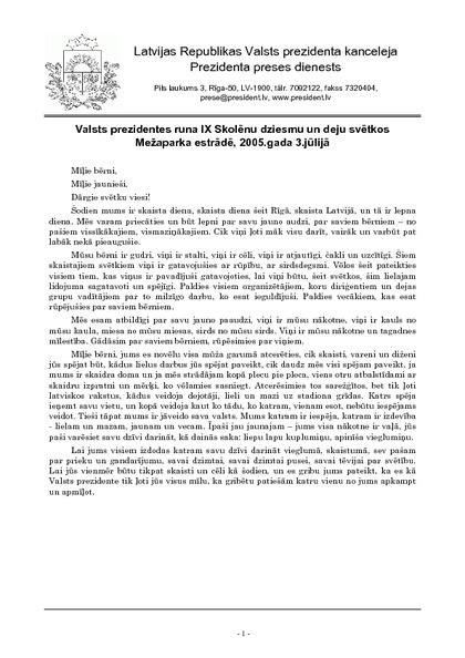 Valsts prezidentes runa IX Skolēnu dziesmu un deju svētkos Mežaparka estrādē, 2005.gada 3.jūlijā