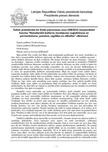 Valsts prezidentes kā Goda patroneses runa UNESCO starptautiskā foruma “Nemateriālā kultūras mantojuma saglabāšana un pārmantošana: jaunatne, izglītība un attīstība” atklāšanā