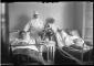 Divi vīrieši, slimnieki guļ gultā. Pie gultām stāv divas sievietes, medmāsas