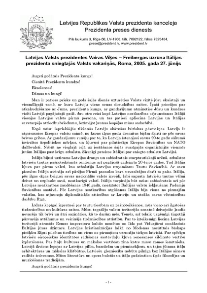 Latvijas Valsts prezidentes Vairas Vīķes – Freibergas uzruna Itālijas prezidenta sniegtajās Valsts vakariņās, Roma, 2005. gada 27. jūnijs