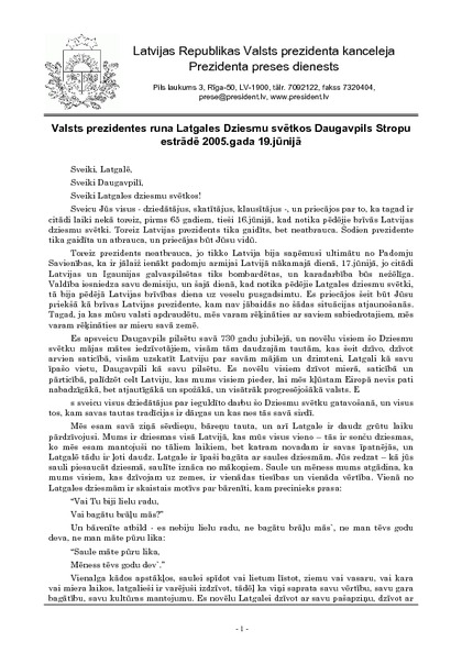 Valsts prezidentes runa Latgales Dziesmu svētkos Daugavpils Stropu estrādē 2005.gada 19.jūnijā