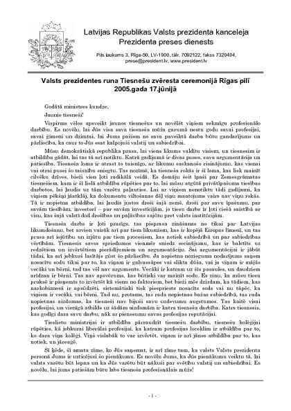 Valsts prezidentes runa Tiesnešu zvēresta ceremonijā Rīgas pilī 2005.gada 17.jūnijā