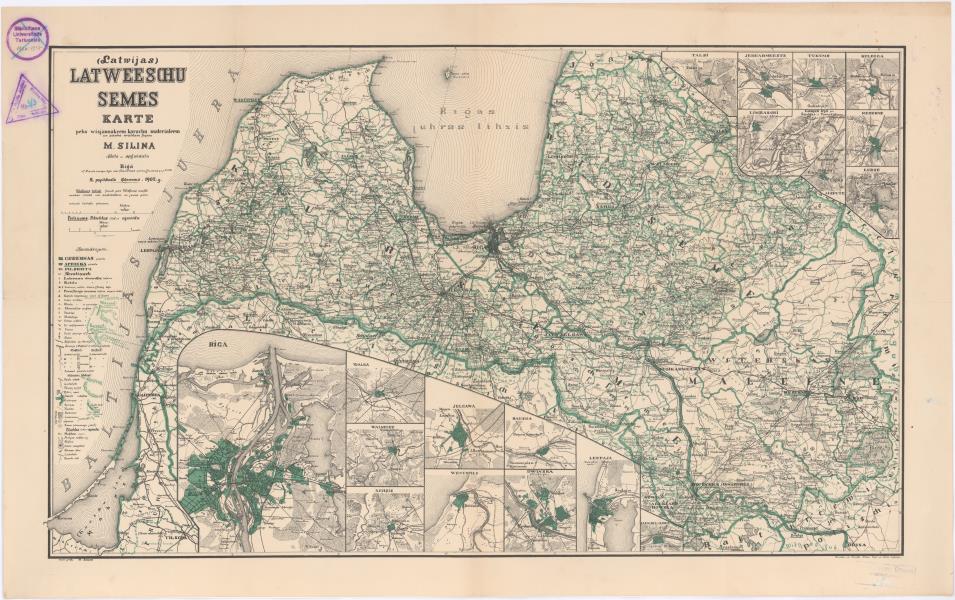 Papildkartes: Rīga ; Valka ; Valmiera ; Cēsis ; Jelgava ; Ventspils ; Bauska ; Dvinska (Dinaburga) ; Liepāja ; Jaunjelgava ; Jēkabmiests ; Talsi ; Tukums ; Kuldīga ; Limbaži ; Aizpute ; Ludza ; Rēzekne ; Gaujas leja pie Siguldas un Turaidas. 1:126,000.