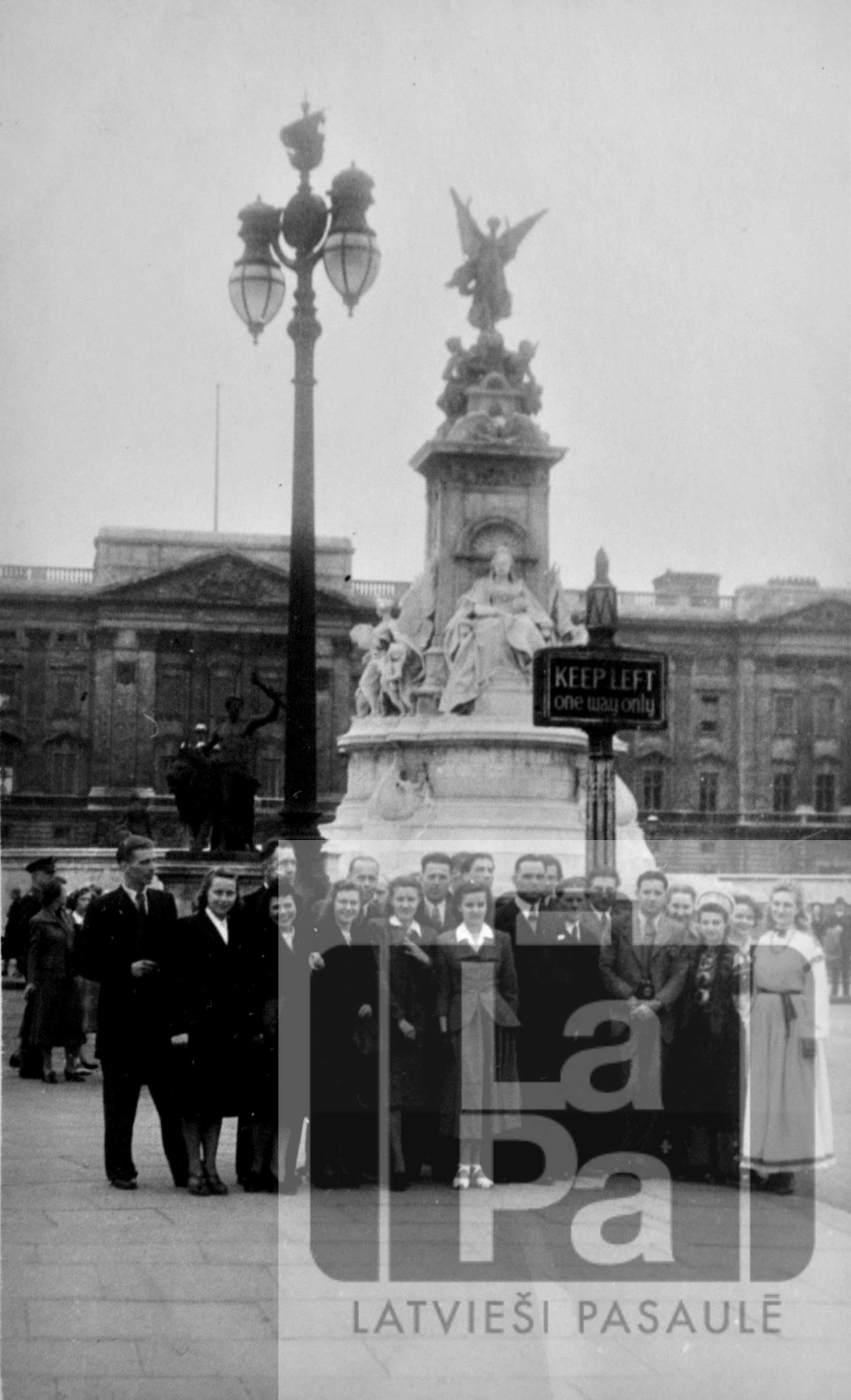 Latviešu grupa Londonā pie Viktorijas pieminekļa un Bekingemas pils