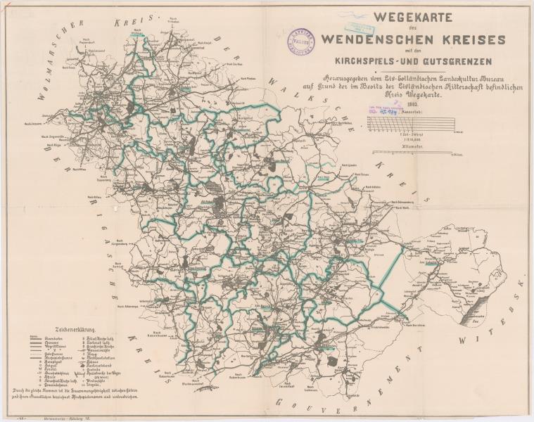 Wegekarte des Wendenschen Kreises mit den Kirchspiels- und Gutsgrenzen