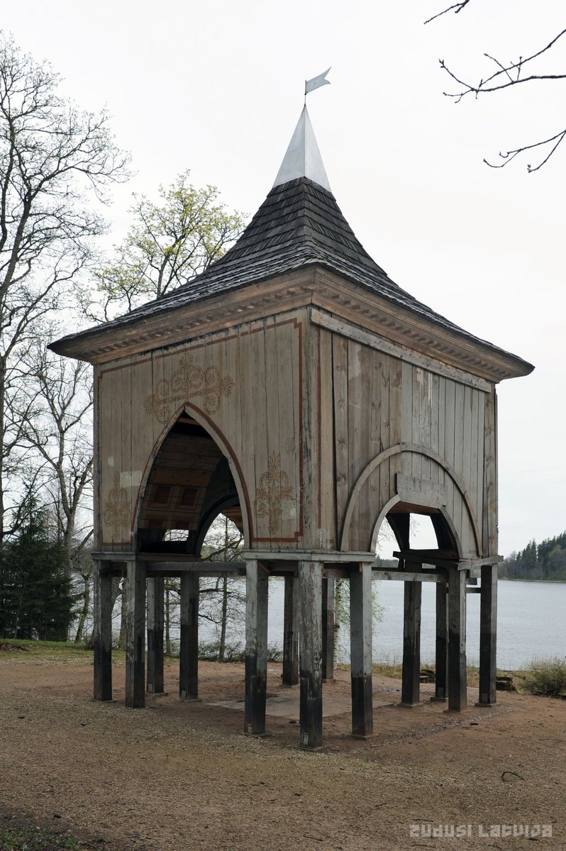 Aleksandra paviljons 19. gadsimta sākumā tapis par godu Krievijas caram Aleksandram I, kurš 1822. gadā, Vidzemei cauri braucot, iegriezies Alūksnē. Pieļauj arī, ka paviljons uzcelts vēlāk, par godu šī notikuma atcerei. Alūksnieši paviljonu dēvē arī par tējas vai kafijas paviljonu, jo nostāsti vēsta, ka baroniem te paticis dzert rīta kafiju. Istabenei nācies mērot tālo ceļu no Jaunās pils līdz paviljonam vairākas reizes, līdz beidzot izdevies atnest pietiekami karstu kafiju. Paviljons būvēts no koka ar skaidu jumta segumu, skārda smaili un karodziņu tā galā. 2006. gadā tika atjaunots Aleksandra paviljona jumts
