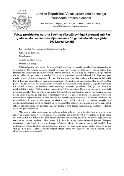 Valsts prezidentes uzruna Saeimas rīkotajā svinīgajā pieņemšanā Par godu valsts neatkarības atjaunošanas 15.gadskārtai Mazajā ģildē, 2005.gada 4.maijā
