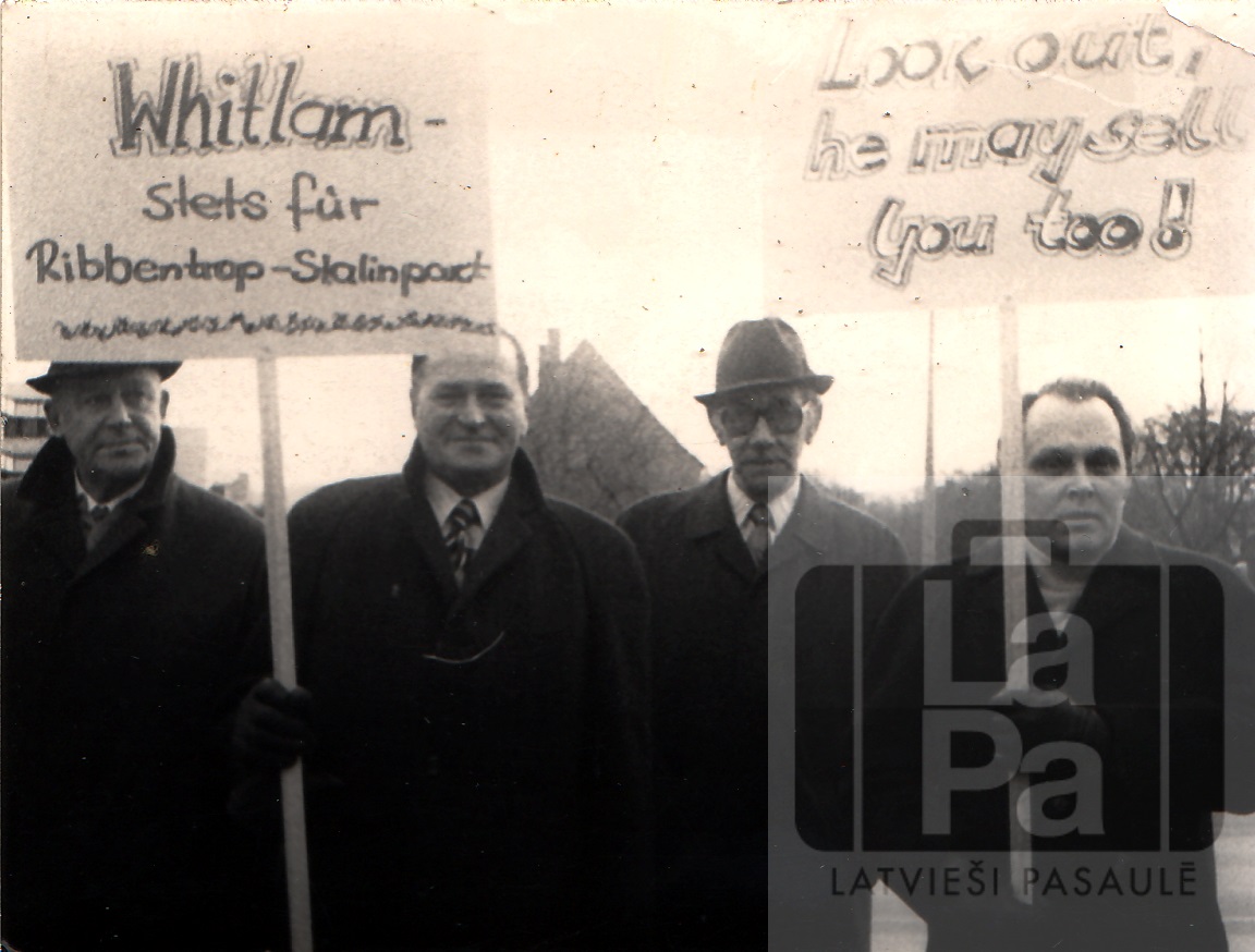 Demonstrācija Rietumvācijā pret Austrālijas Vitlama valdības lēmumu atzīt Baltijas valstu inkorporāciju Padomju Savienībā de iure. Fotogrāfijā redzami četri vīrieši ar plakātiem, uz kuriem rakstīts: "Whitlam – Stets fur Ribbentrop-Stalinpact" (Vitlams – par Ribentropa-Staļina paktu) un "Look out, he may sell you too" (Uzmanies, viņš varētu arī pārdot arī tevi).