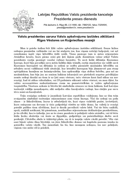 Valsts prezidentes uzruna Valsts apbalvojumu izstādes atklāšanā Rīgas Vēstures un Kuģniecības muzejā